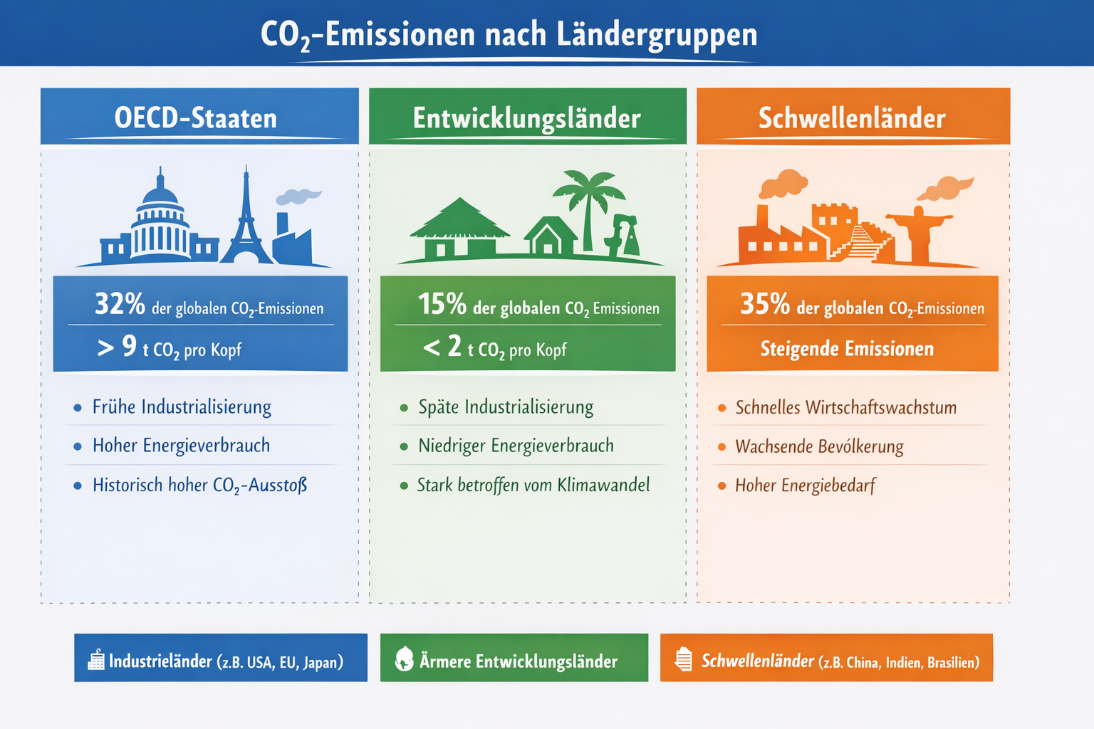 China – größter derzeitiger Emittent (~30 % der weltweiten Emissionen), trotz relativ niedriger Pro-Kopf-Emissionen im Vergleich zu OECD-Durchschnitt.